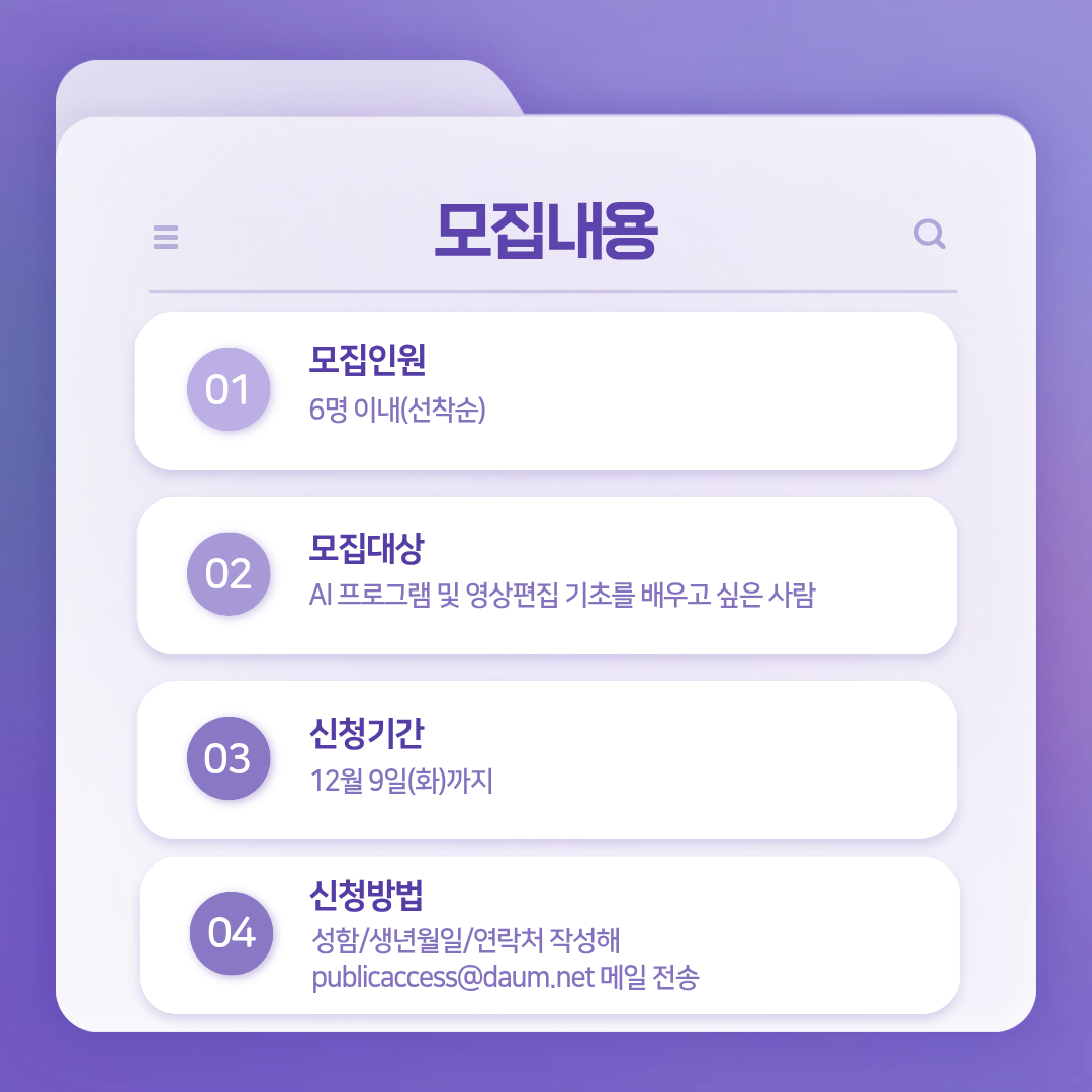 ∎ 신청방법 : 성함/생년월일/연락처 작성해 publicaccess@daum.net 메일 접수