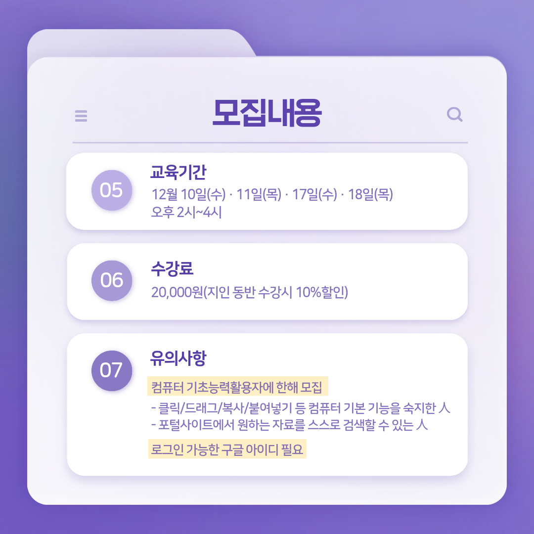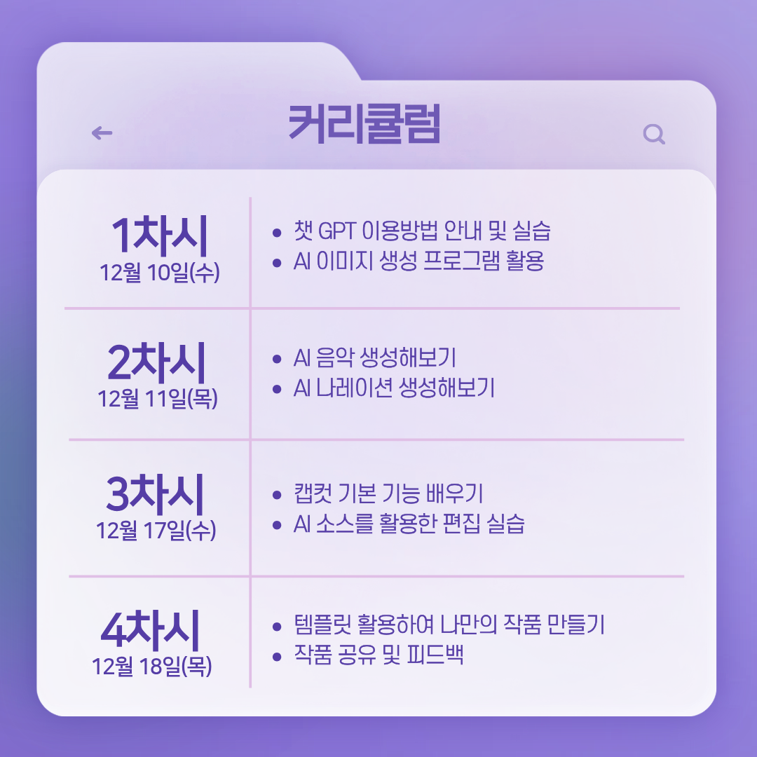 ∎ 교육기간 : 12월 10일(수), 11일(목), 17일(수), 18일(목) 오후 2시~4시