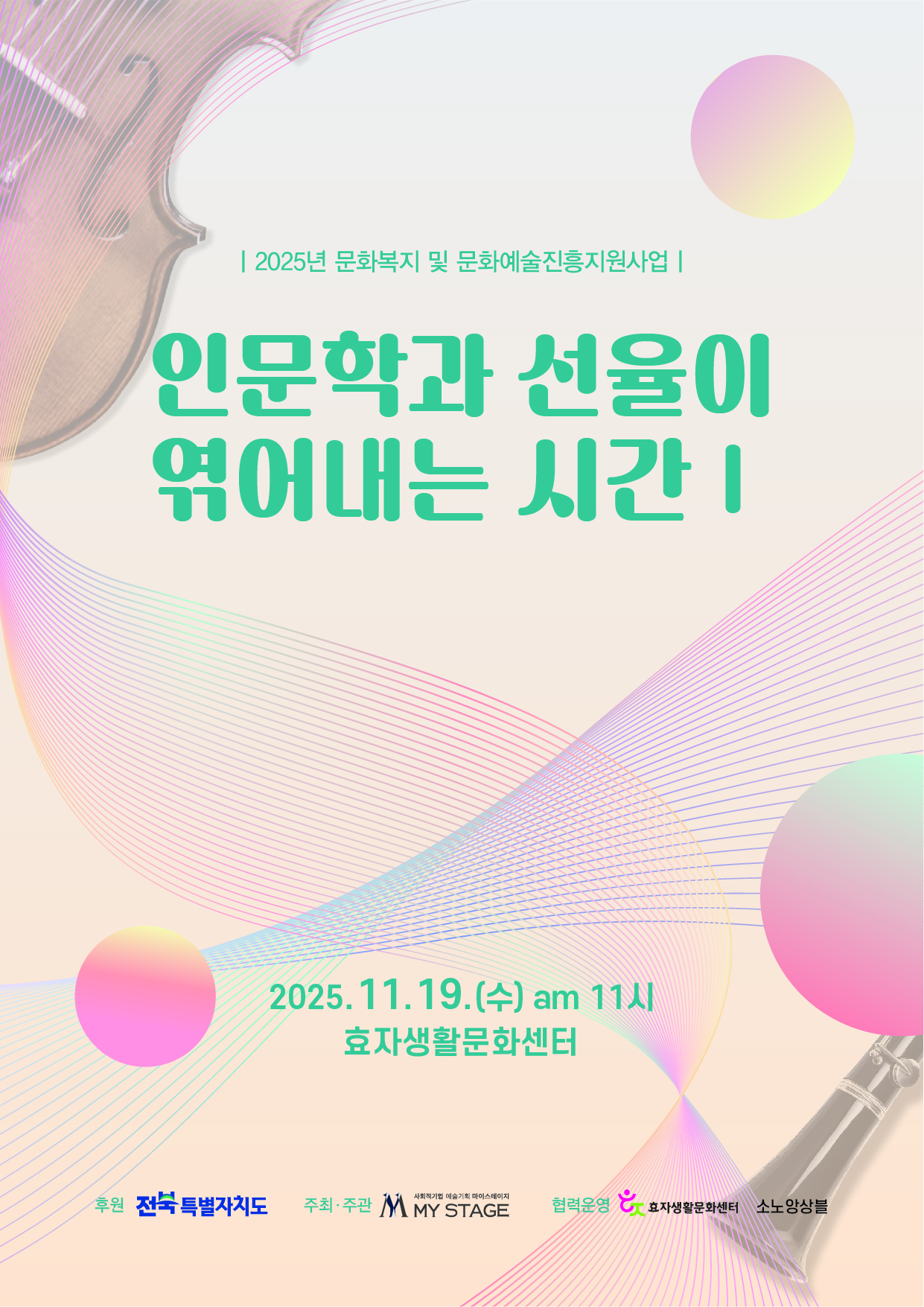 인문학과 선율이 엮어내는 시간 - 참여자 모집 효자생활문화센터2025-11-18조회 13 기간 : 2025-11-19 ~ 2025-11-19 요일 : 수요일 인문학과 선율이 엮어내는 시간소노앙상블과 함께하는 클래식연주회에 여러분을 초대합니다.문의: 063.228.9076 목록보기