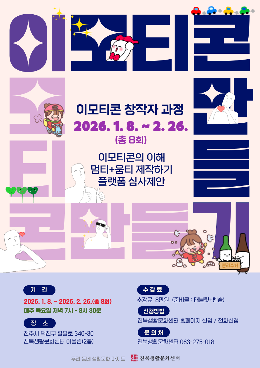 이모티콘 만들기(8주) 수강생 모집(진북생활문화센터) 진북생활문화센터2026-01-02조회 135 기간 : 2025-12-29 ~ 2026-01-09 요일 : 월요일, 화요일, 수요일, 목요일, 금요일 진북생활문화센터 수강신청 페이지 바로가기http://jeonjuculture.or.kr/jinbuk/main/?menu=46&mode=view&no=163 목록보기