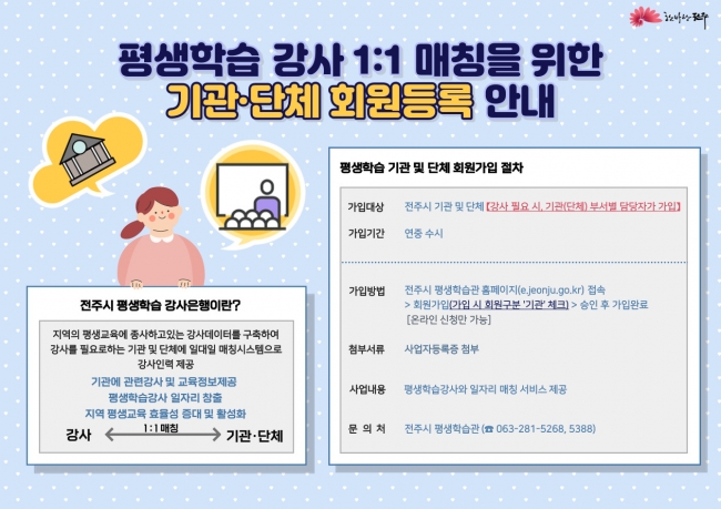 ○ 가입대상 : 전주시 기관 및 단체【강사 수요시 기관(단체) 담당자가 가입】 ○ 가입기간 : 연중 상시 ○ 가입방법 : 전주시 평생학습관(https://e.jeonju.go.kr)→회원가입(회원가입시 회원구분에 기관체크)→승인후 가입완료 ※ 온라인 신청만 가능 ○첨부서류: 사업자등록증 첨부 ○ 사업내용 : 평생학습강사와 수요처(기관, 단체 등) 일자리 매칭 서비스 제공 ○ 문 의 처 : 전주시 평생학습관 ☎ 063-281-5268, 5388 | ||