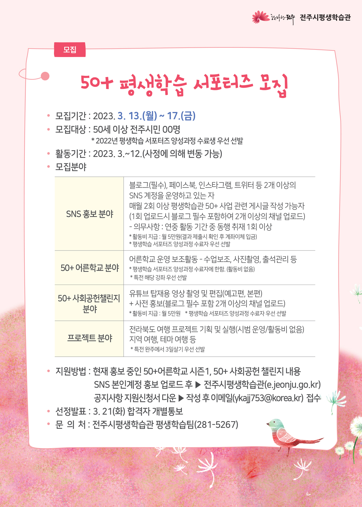 50+ 평생학습 서포터즈 모집 안내 관리자 2023-03-08 조회 3041 50+_평생학습서포터즈_지원신청서.hwp (58.0 KB) 윗글 강원국 글쓰기 특강 아랫글 50+ 사회공헌챌린지 3월 참여자 모집 및 지원신청 모집 안내 목록보기