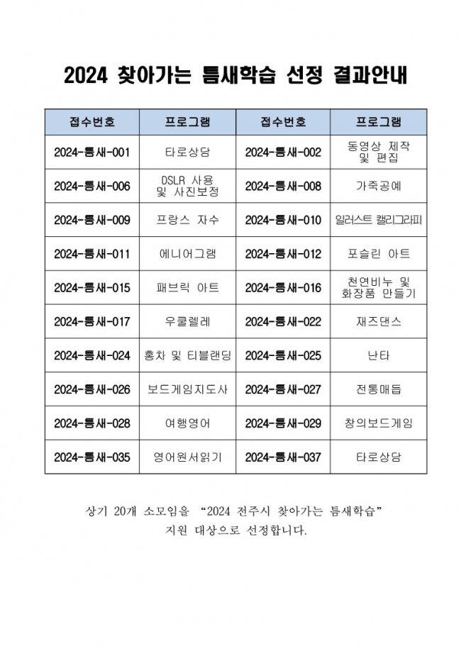 2024 전주시 찾아가는 틈새학습 소모임 선정 심사 결과 관리자 2024-04-22 조회 1911 result.jpg (276.4 KB) 윗글 2024 전주시 찾아가는 틈새학습 운영 강사 모집 공고 아랫글 퍼실리테이터과정(커뮤니티리더) 참가자 모집 안내(4. 24(수) 09:00~) 목록보기