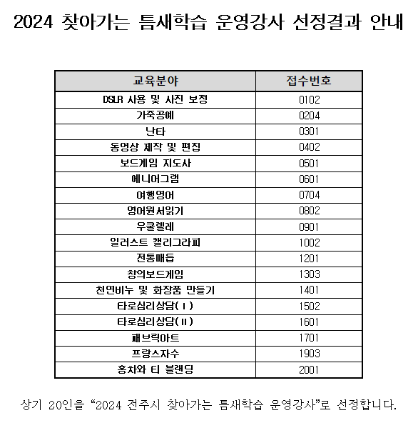 2024 찾아가는 틈새학습 운영강사 선정결과 안내 관리자 2024-05-10 조회 2038 result.png (14.9 KB) 윗글 2024 전주시 열린시민강좌 제217회 안내 아랫글 2024년 디지털문해교과서(소통형 메신저 2종) 무상 보급 신청 안내 목록보기