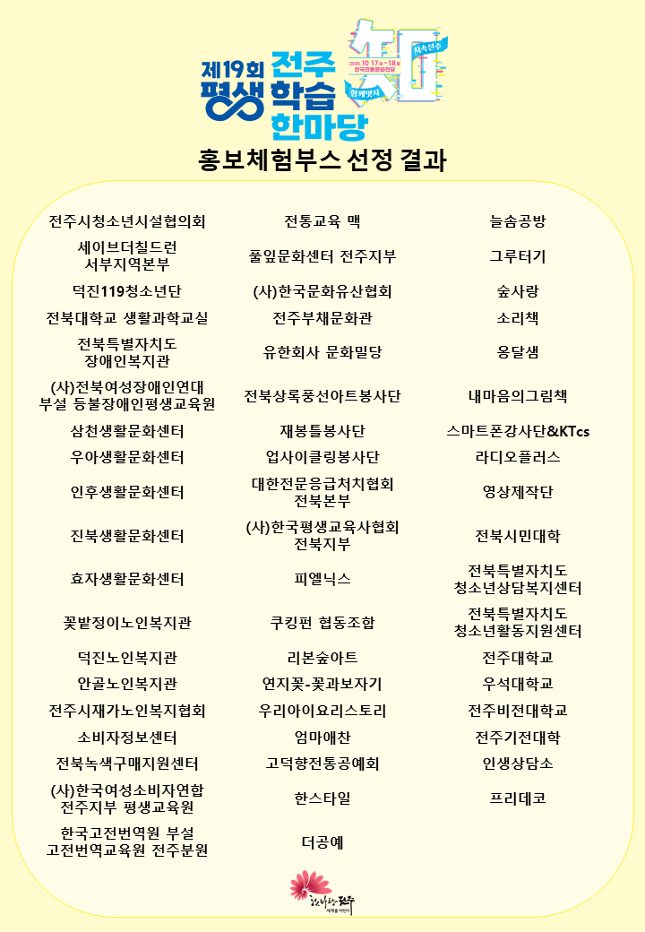 제19회 전주평생학습한마당 홍보체험부스 선정 안내 관리자 2025-08-22 조회 468 윗글 시민 라디오 제작교육 7기를 추가 모집합니다. 아랫글 제19회 전주평생학습한마당 개최 목록보기
