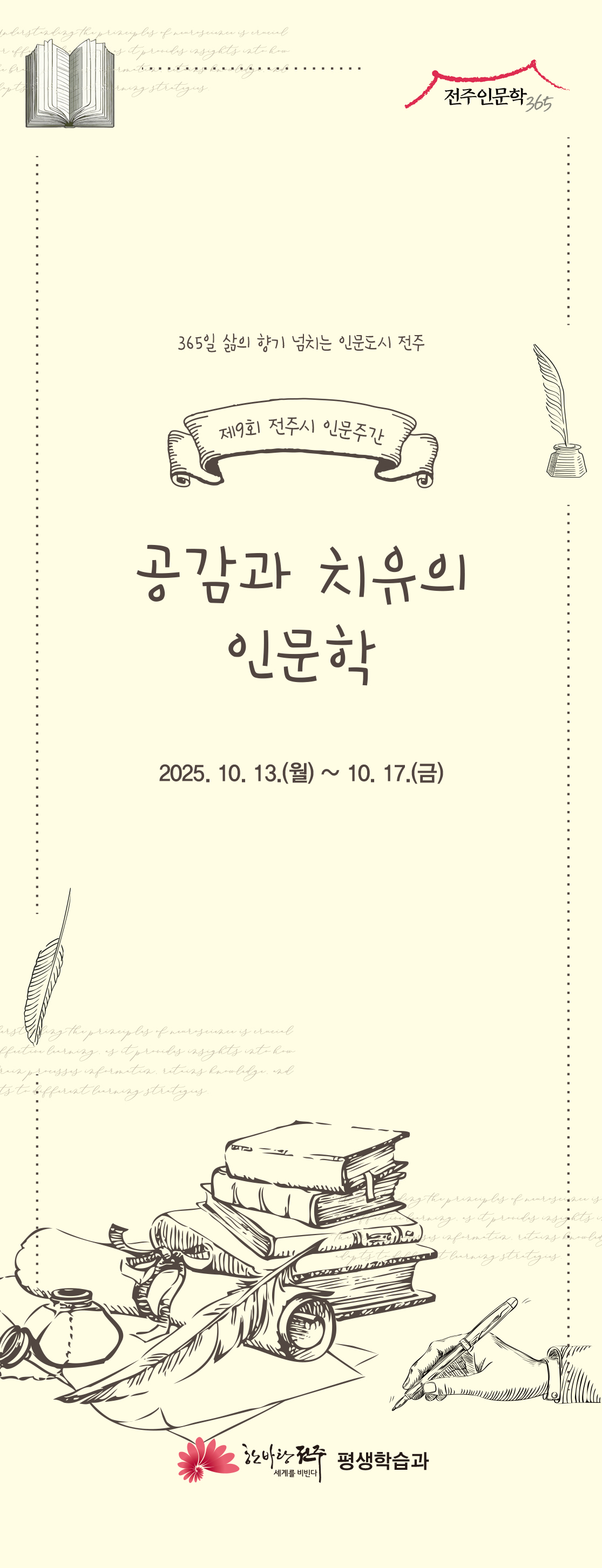 이번 기획강좌는 단순한 작가 낭독회가 아닌, 실패담을 통한 공감과 위로, 작가와 독자의 쌍방 대화, 음악과 낭독이 어우러진 감성 무대로 기획하여, 인문주간의 핵심 주제인 ‘인간 이해와 성찰’을 시민들이 직접 체험할 수 있도록 합니다.