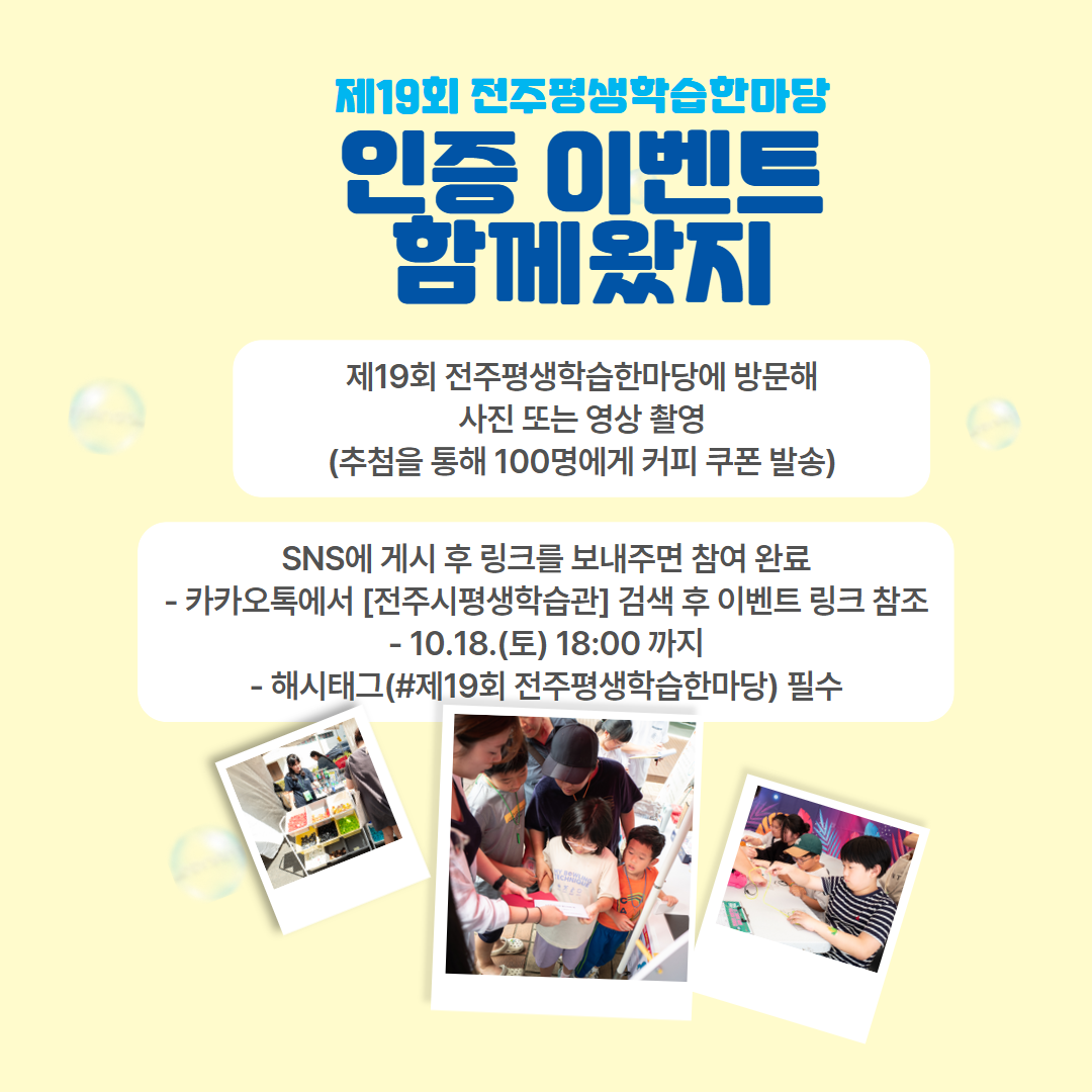 제19회 전주평생학습한마당 참여 인증 이벤트 "함께왔지" 관리자 2025-09-24 조회 607 참여하기 윗글 제19회 전주평생학습한마당 얼리버드 인증 이벤트 "일찍왔지" 아랫글 [평생학습관x도서관] 스마트폰 활용 등 쌈지교실 수강생 모집 목록보기