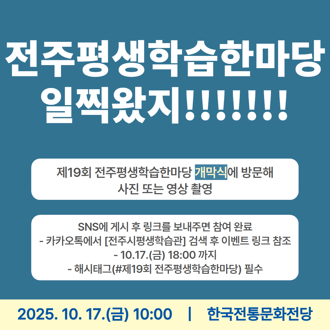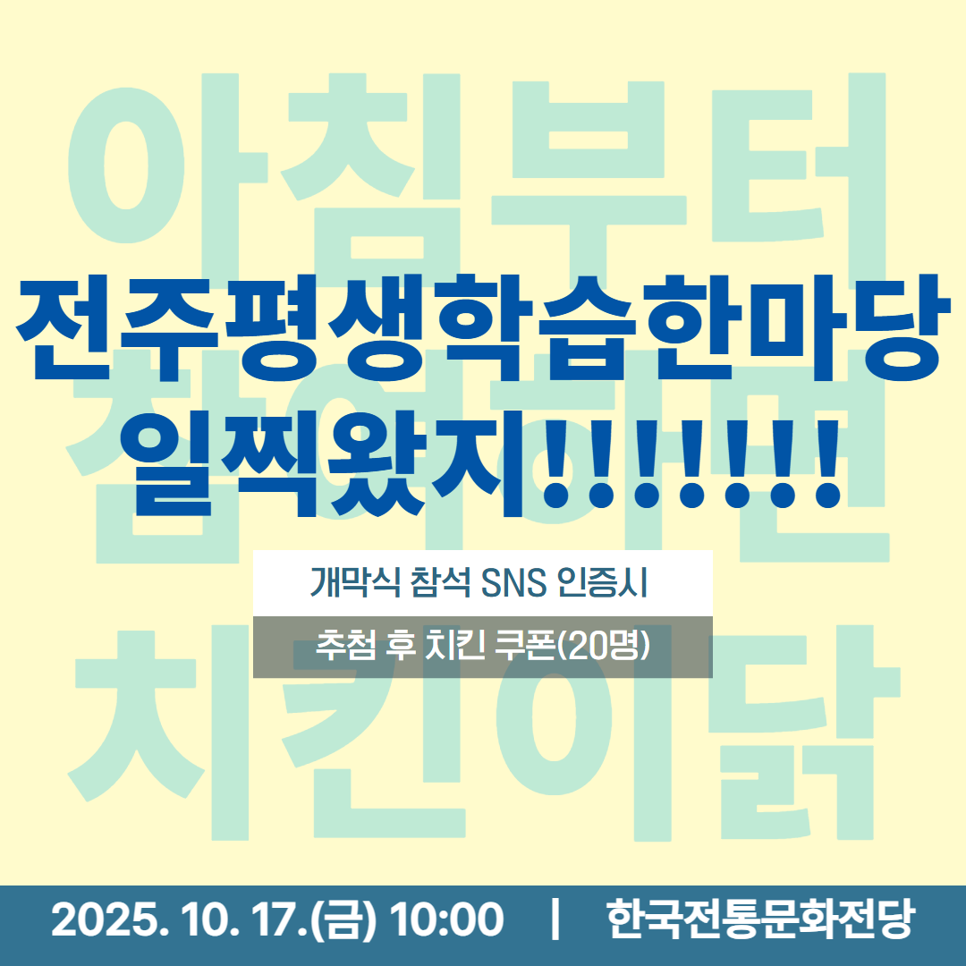 제19회 전주평생학습한마당 얼리버드 인증 이벤트 "일찍왔지" 관리자 2025-09-24 조회 678 참여하기해당 행사는 기존 개막식 사전접수자의 참여는 제한합니다. 윗글 제19회 전주평생학습한마당 행사지원 자원봉사자 관련 공지 아랫글 제19회 전주평생학습한마당 참여 인증 이벤트 "함께왔지" 목록보기