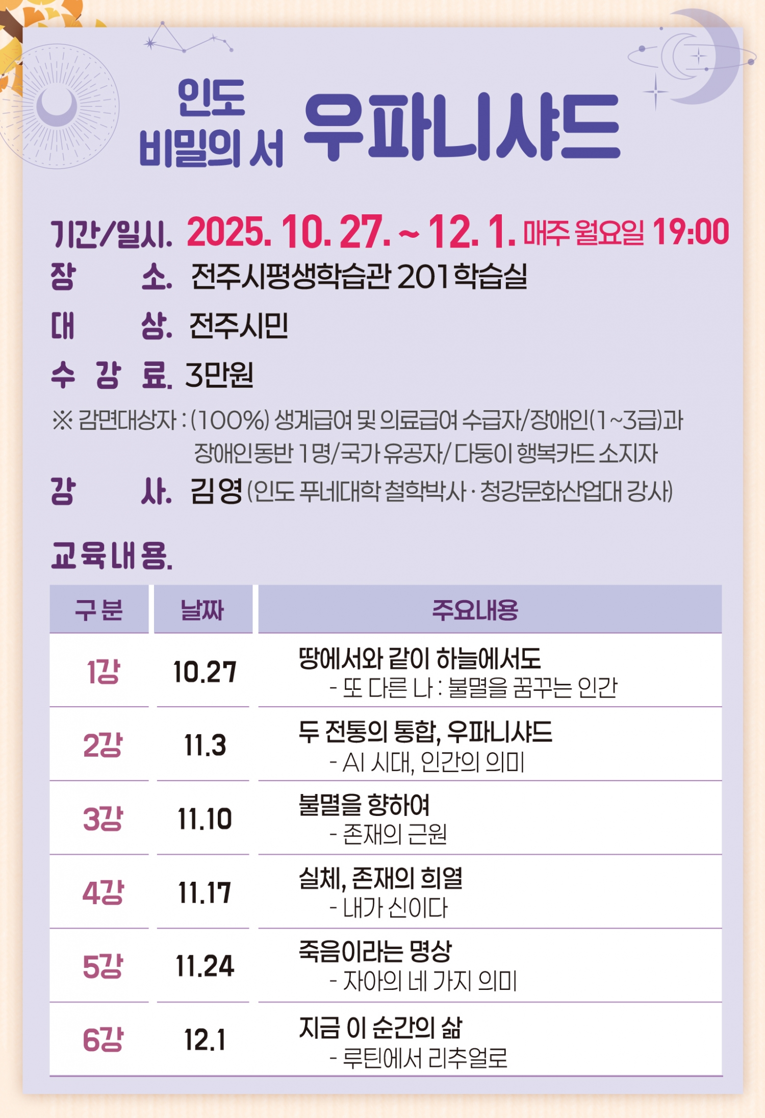 이 강좌는 산스크리트 원문을 직역하여 현대인의 시각에서 새롭게 풀어낸 해설서, 『우파니샤드 : 인도 비밀의 서』를 교재로 하여, 인도고전이 담고 있는 깊은 철학적 함의를 삶을 위한 철학으로 온전하게 담아내는 강의다. 우파니샤드가 전하는 ‘내면의 탐구’와 ‘자기 초월’의 메시지는 루틴과 리추얼을 통해 실용 지침이 된다. 바쁜 일상 속에서 길을 잃었다고 느끼는 사람들에게, 이 강의는 자기 자신을 다시 찾을 수 있는 나침반이 되어줄 것이다.