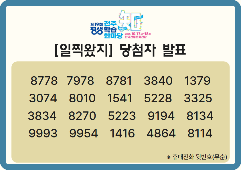제19회 전주평생학습마당 "일찍왔지" 선정 안내 관리자 2025-10-22 조회 353 신청자를 대상으로 무작위 난수 추첨방식을 통해 당첨자가 선정되었으며, 개별 연락 드렸습니다.많은 관심에 감사드립니다. 윗글 제19회 전주평생학습마당 "함께왔지" 선정 안내 아랫글 인문특강; 숲의 말을 듣는 법 목록보기