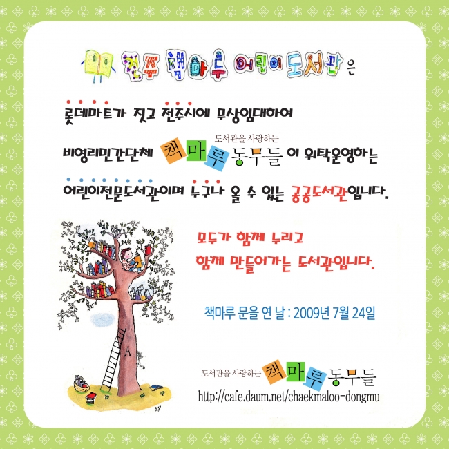 [도서관] 전주책마루어린이도서관 운영주체 도서관을사랑하는 책마루동무들 운영시간 평일:화~금(10:00~18:00)/토요일:(10:00~17:00)/일요일(1,3,5주 운영):(13:00~17:00) 전화번호 063-252-1612 팩스번호 063-253-1612 주소 전주시 덕진구 솔내2길 21, 전주책마루어린이도서관 (54837) 홈페이지 https://cafe.naver.com/bookfloor 기관소개 전주책마루어린이도서관은 2009년 7월 24일 개관한 전주시공립작은도서관입니다. (주)롯데쇼핑이 전주시에 무상임대하고 ‘도서관을사랑하는 책마루동무들’이 민간위탁운영하는 아이들과 어른들의 책놀이터입니다. '0세부터 100세까지' 누구나 와서 누리는 시민도서관입니다. 주요사업 *책읽어주기 *낭독하기 *1책읽고 책수다(비경쟁토론) *세대별 독서동아리 (북스타트 품앗이영유아모둠, 어린이독서동아리, 성인독서동아리-그림책, 인문고전, 문화예술, 시니어독서동아리 등) *독서문화예술과 작가와의 만남(강연) *한솥밥축제 *어린이작업실 '모야' 운영 주요시설 *열람실 *소모임 방, 교육장, 빛그림방(영화상영관) *주방 *어린이작업실 '모야' 기관위치 목록
