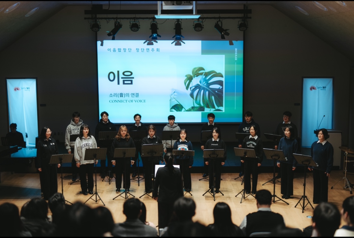 이음합창단은 20대부터 40대까지 노래를 좋아하는 사람들이 모인 곳입니다. 단순한 노래 부르기가 아닌 합창의 발성을 기초로 하여 뮤지컬부터 가곡, 가요 등 다양한 장르를 다루며,연 1회 정기연주를 목표로 함께 즐겁게 노래하고 있습니다. ※ 종교...